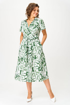 Платье женское из 2-х видов блузочной ткани (однотон и горох) прямого силуэта. По полочке идет фигурный подрез под грудью, переходящий в фигурный подрез по спинке. По юбке по подрезу идет сборка и клапаны. По полочке идут грудовые выточки из проймы. Застежка - планка на петли и пуговицы. Воротник с отрезной стойкой. По спинке - отрезная кокетка. Рукав 3/4 длины на манжете. В качестве декора -термонаклейка в верхней части полочки. Длина по спинке (верх): (50-54) - 42см, (56-60) -44см. Длина (юбкапо боку): (50-54)-75см, (56-60)-77см. Длина рукова с манжетой:(50-54)-46см, (56-60)-47см