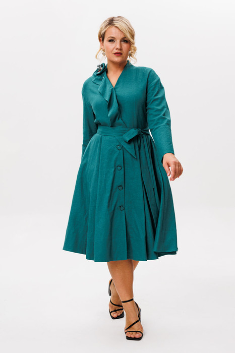 Элегантное женское платье  необычного кроя станет изюминкой вашего гардероба. Платье  прилегающего силуэта, отрезное по линии талии, по передеу застежка на петли и пуговицы, в верхней части платья по полочке прилегание создается за счет талиевых выточек, по спинке - за счет резинки по линии талии.  Юбка-полусолнце с односторонними  складками, по бокам карманы. Плечо спущенное, рукав укороченный, на высокой  манжете на одну пуговицу. Горловина по полочке выполненна в виде цельнокроеной стойки, переходящей в отрезную по спинке. В качестве декора по краю борта идет жабо, переходящее в цветок.  В комплекте съемный пояс в тон платья и брошь ВНИМАНИЕ! брошь может отличаться от фото. Длина по спинке:-111см. Длина рукава с манжетой-51см.