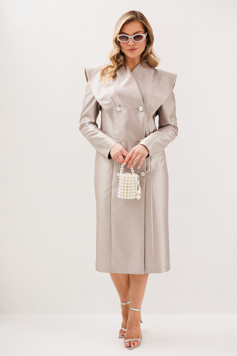 Оригинальное женское платье с крылышками в зоне плеч и груди идеально дополнит женственный образ для любого торжества. Платье из текстильной ткани двубортное, полуприлегающего силуэта. По полочке и спинке прилегание создается за счет рельефов, выходящих из плечевого шва. По спинке - средний шов, переходящий в шлицу. По горловине цельнокроеная стойка. Застежка на петли и пуговицы. Рукав втачной одношовный с открытым плечом. Длина по спинке: (48-54)-119 см. Длина рукава: (48-54)-52см
