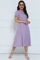 Платье полуприлегающего силуэта, длиной за колено, выполнено из однотонной ткани, в качестве отделки использована контрастная по цвету ткань с легким атласным эффектом.