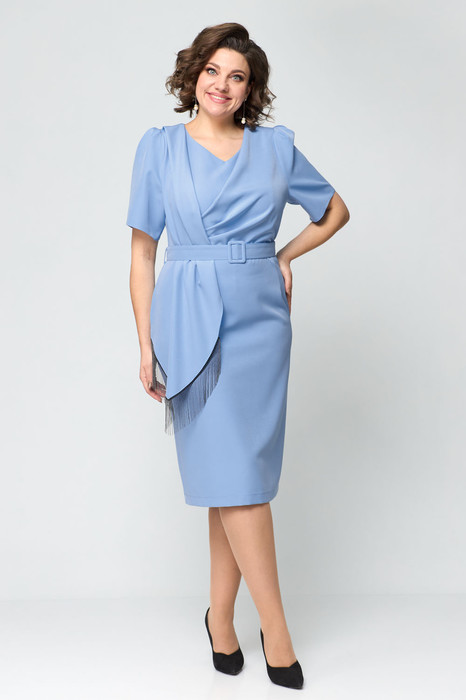 Платье полуприлегающего силуэта, длиной за колено, выполнено из однотонной ткани. Передняя часть платья состоит из верхней и нижней части платья. Нижняя часть лифа полочки с вертикальными рельефами. Верхняя левая часть со складками, правая часть в виде детали-хвоста, закрепленного в плечевой срез и пройму. Низ хвоста с декором из тесьмы. Горловина V-образной формы. Нижняя часть переда с талиевыми вытачками. Спинка со средним швом и вертикальными рельефами. В верхней части среднего шва спинки обработана потайная молния, в нижней части разрез. По боковым швам в области талии настрочены шлевки, через которые продет пояс с пряжкой. Рукав длиной до локтя, втачной, одношовный. По окату рукава обработаны складки. Платье на плечиках.
