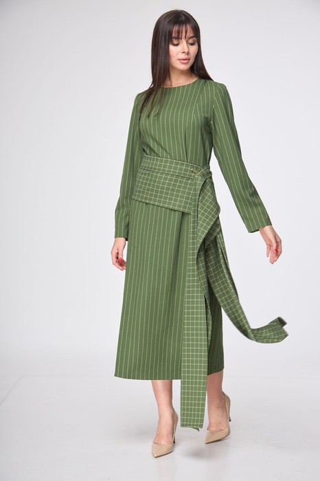 Платье прямого силуэта, зауженное по талии, длиной до середины голени, с потайной застёжкой молнией по спинке. Длинный рукав. По переду разрез, который придаст вашему образу игривости. Платье со съёмным поясом, при помощи которого можно создавать различные образы давая волю фантазии. Платье будет актуально, как и для повседневной носки, так и для торжеств.