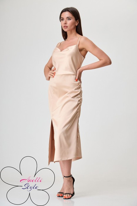 Платье женское полуприлегающего силуэта, на брителях, длина миди. По переду качеля, отрезное по талии. Спереди по юбке игривый разрез. По боковому шву слева функциональный шнурок, благодаря которому вы можете регулировать сборку. В правом боковом шве потайная молния. Платье идеальный вариант для стильных и уверенных в себе девушек. Отлично подойдёт для торжеств: выпускных, свадеб и тп. А так же его можно носить ежедневно, как сараван на футболку и низком ходу. Платье можно дополнить аксессуарами и оно отлично будет смотреться с поясом, дополнительно подчеркивающим вашу талию.