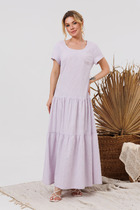 Элегантный V-образный вырез горловины подчеркивает линию шеи, добавляя образу женственности и утонченности. Удобная планка с застежкой на петли и пуговицы придает платью стильный акцент и позволяет легко регулировать посадку.