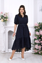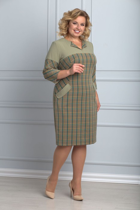 Платье прямого силуэта,по переду центральный шов, рельефы, переходящие в бочок, в рельефах рабочие карманы с притачным клапаном; вырез горловины круглый с разрезом, которые обработаны притачными деталями. Пройма с притачной фигурной деталью. Спинка со средним швом и талевыми вытачками. Модель с подчёркивающим фигуру кроем.