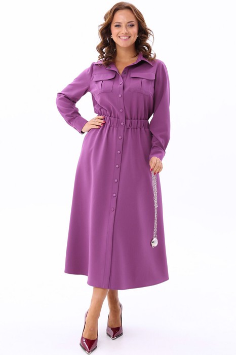 Платье полуприлегающего силуэта, расклешенное книзу. Воротник отложной, на притачной стойке. Платье отрезное по линии талии, на широкой резинке. Платье с центральной застежкой на кнопки на притачных планках. Полочка с нагрудными вытачками и накладными карманами со складкой и клапаном. В боковых швах юбки функциональные карманы. Рукав втачной длинный, понизу - широкая притачная манжета с застежкой на кнопки.