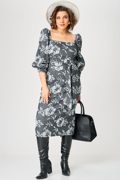 Платье приталенного силуэта, чуть ниже колена из костюмно-плательной ткани. Вырез горловины квадратной формы. Отрезное по линии талии. Перед и спинка с рельефами. По спинке средний шов, в котором вставлена потайная молния, внизу разрез. Рукав втачной широкий длинный, по окату собран на резинку. Длинный рукав легко превратить в три четверти с помощью резинки, вставленной по низу рукава. В комплект входит пояс из основной ткани.
