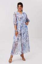 Платье полуприлегающего силуэта, расклешенное книзу. Воротник отложной, на притачной стойке. Платье отрезное по линии талии, на широкой резинке. Платье с центральной застежкой на петли и пуговицы на притачных планках. Полочка с нагрудными вытачками. В боковых швах юбки функциональные карманы. Рукав втачной короткий, с открытым плечом и декоративной патой на пуговице, понизу - притачная манжета.