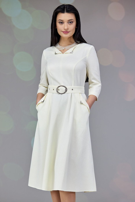 Красивое женское платье для создания утонченных и ярких образов. Платье соответствует модным тенденциям 2022 года. Широкий размерный ряд платья, включающий большие размеры, позволит вам подобрать подходящий размер. Платье актуально в любое время года. Станет идеальным вариантом, как для торжественных мероприятий,  на праздник, выпускной, корпоратив, Новый год, день рождения, юбилей, так и для деловых и повседневных встреч, офиса. Женское платье отрезное по линии талии. Лиф платья по переду с рельефными швами. Спинка со средним швом, в котором находится потайная молния. Приталивание спинки лифа достигается при помощи талиевых вытачек. Юбка платья солнце-клеш.Рукав прямой двухшовный 3/4. К платью прилагается съемный пояс. Длина 115 см