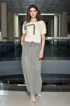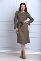 Платье полуприлегающего силуэта, отрезное по линии талии. Горловина с фигурным вырезом, обработана обтачкой. По переду лифа - рельефные швы. По спинке лифа талиевые вытачки и средний шов, в котором обработана потайная молния. Юбка платья "клеш". Рукав втачной прямой, длиной 3/4. В комплекте к платью прилагается съемный пояс.