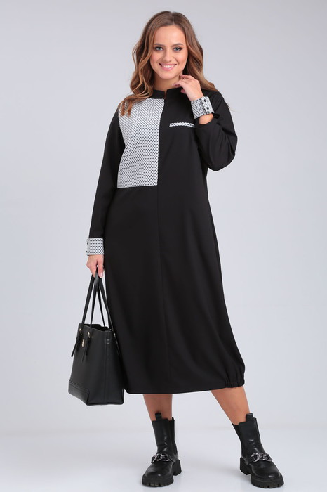 Платье свободного силуэта из костюмно-плательной ткани. Горловина округлой формы со стойкой. Перед платья с застежкой на молнию в среднем шве, нагрудными вытачками, подрезом и карманом-обманкой из отделочной ткани. Спинка со средним швом, подрезом из отделочной ткани и декоративной нашивкой. В боковых швах глубокие функциональные карманы. Рукав втачной длинный, по низу декоративная манжета с застежкой на петлю и пуговицу. По низу платья по бокам вставлены резинки.