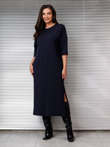 Платье полуприлегающего силуэта выполнено из плотного полотна с блеском черного цвета. Идеальный вариант платья для создания вечернего образа. Характеристики: полуприлегающий силуэт, подкладка, отрезное, отрез - стабильная вставка, фигурный вырез горловины, по переду функциональные пуговички, рукава объёмные верх и низ рукава на резинки, рукава могут быть спущены на плечи, застежка потайная тесьма молния в среднем шве заднего полотна, юбка в изделии свободного кроя с подгибом на резинке. Длина от плеча 127 см, длина рукава 61 см.