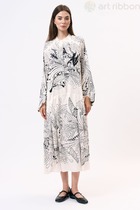 Платье полуприлегающего силуэта выполнено из полотна с абстрактным контрастным принятом. Характеристики: прилегающий силуэт, подкладка, отрезное, по отрезу фигурная вставка со сборкой, горловина V образный вырез, по переду изделия не функциональные пуговички, рукав втачной по низу рукава манжета на резинке, по спинке в области фигурной вставки - резинка венгерка, низ в изделии свободного кроя на подкладке. Длина изделия по спинке 90 см, длина рукава 57 см.