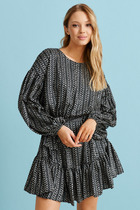 Платье полуприлегающего силуэта выполнено из полотна цвета медь с принтом полевые цветы. Характеристики: полуприлегающий силуэт, отрезное выше талии, фигурный вырез горловины, по переду в области груди декоративная не съёмная деталь, низ и верх рукава на резинка, застежка потайная тесьма молния в среднем шве заднего полотна изделия, юбка в изделии свободного кроя с разрезом (разрез 34 см). Длина по спинке от верхнего края рукава 133 см, длина рукава 63 см.