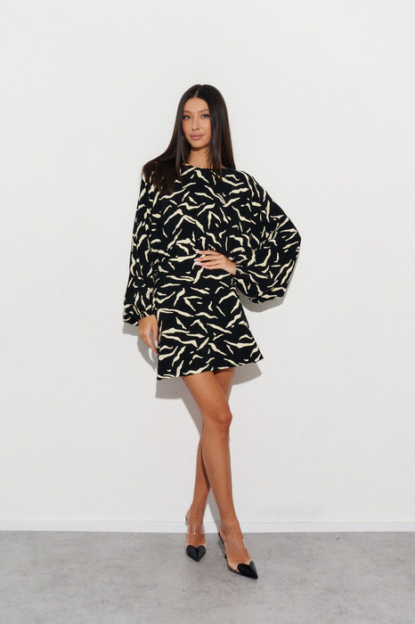 Платье полуприлегающего силуэта выполнено из полотна с контрастным принтом. Характеристики: полуприлегающий силуэт, отрезное , горловина овальная, рукав свободного кроя цельнокроеный, по низу рукава резинка, застежка потайная тесьма молния в среднем шве заднего полотна изделия. Длина по спинке 84 см длина рукава от края горловины 73 см.