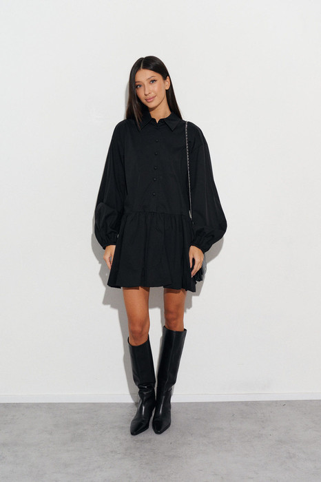 Платье прямого кроя выполнено из полотна черного цвета. Характеристики: прямой крой, отрезное, отложной воротник, застежка центральная на петли пуговицы, рукав свободного кроя спущен, по низу рукава резинка, низ в изделии на резинке на подгибе. Длина 84 см, длина 80 см.