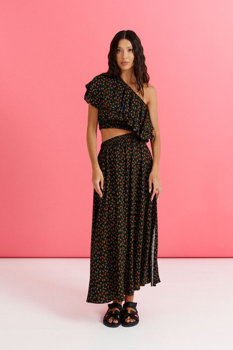 Платье с открытым плечом выполнено из полотна с цветочным принтом. Характеристики: полуприлегающий силуэт, открытое плечо, в области горловины нашит широкий волан из ткани основного изделия, отрезное с декоративным вырезом по отрезу, по линии отреза по нижней и верхней части изделия резинка. Длина от верхнего края плеча 130 см.