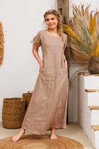 Платье-мини полуприлегающего силуэта. Выполнено из лёгкого натурального полотна рами кораллового цвета. По переду и по спинке запах (симметрично). Рукав цельнокроеный, внизу на резинке. Плечевой шов со сборкой. По линии талии широкая венгерка. Юбка свободная, с подкладкой, с воланом и рюшей. Длина рукава (с учётом плечевого шва) 80 см. Длина от плечевого шва 87 см