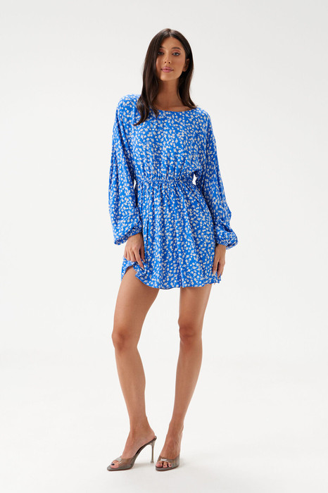 Платье - мини полуприлегающего силуэта выполнено из голубого полотна с белым цветочным принтом. Горловина овальная. Отрез ниже талии на резинке. По лифу спинки вырез с завязками. Рукав спущенный, присборен на резинку. Длина платья 84 см, длина рукава от горловины 76 см.