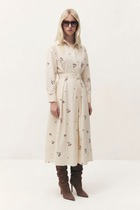Платье из трикотажного полотна «кулирка» с набивным рисунком, отрезное по талии, с короткими втачными рукавами, горловиной V-образной формы, окантованной основным материалом и карманами в боковых швах. Полочка – с рельефами, выходящими из плечевых швов. Входы в карманы окантованы. Юбка – широкая, присборенная по шву стачивания с лифом и оборкой по низу.