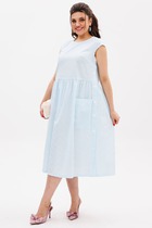 Платье женское летнее из тонкой плательной ткани. Свободное, расширенное к низу, с воланами по переду спинки от линии талии, с втачным рукавом 3/4 длины на эластичной тесьме по низу рукава, в боковых швах - карманы, длина изделия до колена.