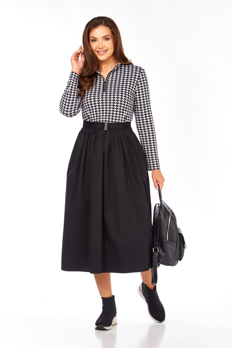 Верхняя часть платья выполнена из трикотажного полотна, с центральной застёжкой на металлическую тесьму-молнию.Спинка цельная.Рукава втачные длинные одношовные.Круглый вырез горловины обработан двойным притачным воротником-стойкой.