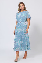 Нарядный летний вариант, идеально подходящий как для вечерних мероприятий, так и для дневных прогулок. Легкая ткань обеспечивает комфорт даже в самые жаркие дни, а универсальный дизайн позволяет комбинировать модель с различными вариантами обуви и аксессуаров. Платье отрезное по линии талии, со скрытой резинкой, обеспечивающей удобную посадку. Воланы по переду и низу юбки подчеркивают романтичный стиль, а цельнокроеные рукава превращаются в изящные крылышки, добавляя образу нотки нежности и воздушности. Модель с круглой формой горловины, со сборкой по переду и застёжкой на петли и отделочные пуговицы по спинке. Лиф платья и расклешенная юбка продублированы подкладкой из вискозы. Линия талии красиво подчёркнута поясом-ремнём с пряжкой.