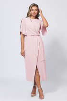 Красивое платье с имитацией запаха идеально подойдёт для создания стильного, нарядного образа. Для пошива модели использовали материал на основе мягкой и приятной к телу вискозы с полиэстером.Рукава-воланы с красиво мерцающей стразиной и мягкие драпировки делают силуэт изделия очень лёгким и воздушным , а каплевидный вырез с пуговицей-стразиной и фигурный разрез по низу придают образу женственности и сексуальный штрих. Талия изделия акцентирована скрытой резинкой.