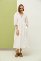Платье женское, повседневное, полуприлегающего силуэта, отрезное по линии талии, длиной ниже линии колен, из хлопковой ткани. Перед с застежкой на пуговицы. Вырез горловины обработан воротником на стойке. Рукав втачной, по низу обработан цельнокроенной манжетой. Длина по спинке 117 см, длина рукава 16,5 см.
