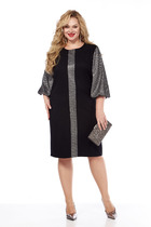 Платье женское прямого силуэта с разрезами в боковых швах. Прилегание достигается за счет нагрудной выточки и талиевой по спинке. Рукав втачной короткий, перед и спинка украшены отрезными цветными полосками. В комплект идет сьемный пояс