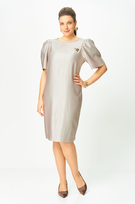 Элегантное женское платье, выполнено из плательной ткани с небольшим блеском. Платье полуприлегающего силуэта, горловина круглая. По спинке в центральном шве разрез возле горловины с завязкой и разрез по низу. Платье без подкладки.