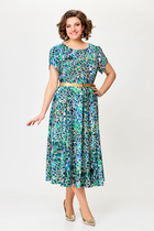 Платье летнее из хлопкового шитья. Полуприлегающего силуэта, с втачным рукавом, отрезное по талии. Полочка отрезная по талии, с нагрудной вытачкой. Нижняя часть платья присобрана по линии талии. По низу отрезной волан. Спинка с фигурным вырезом, застежкой по горловине спинки на пуговицы, и от боковых швов с пояском на завязках. По талии отрезное, нижняя часть вверху на резинке, по низу отрезной волан со сборкой. Рукав внизу на узкой манжете, присобран по окату и по шву притачивания манжеты.