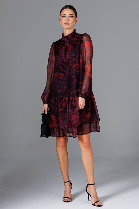Платье А-силуэта. С втачным рукавом со сборкой по окату и внизу, на манжете с застежкой на петлю-пуговицу. По переду планка с застежкой на петли-пуговицы. Полочка и спинка с притачными воланами по низу. Платье на подкладке. Воротник стойка с рюшей.