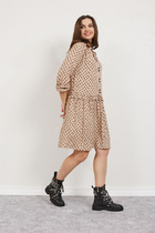 Воздушное платье полуприлегающего силуэта с цветочным принтом. Короткие спущенные рукава. Горловина на внутренней обтачке оформлена "лодочкой". Модель отрезная по талии, собрана на резинку. Низ ровный, без разрезов.