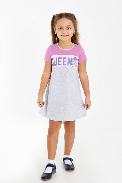 Платье из легкой хлопковой ткани, расклешенное к низу. Рукав втачной, короткий. Спинка отрезная выше талии. Средняя часть полочки украшена шелкографией. Горловина отделана узкой обтачкой из эластичной ткани. Ткань гипоаллергенная, хорошо пропускает воздух.