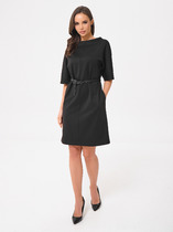 Платье женское свободного кроя. Спинка с плечевой кокеткой, средним швом и разрезом. Перед с нагрудными вытачками, имитацией косого полузакоса, накладным карманом с клапаном, нашивкой и встречными складками. Рукав цельнокройный с отложными манжетами. Горловина V-образная. Пояс отлетной из отделочной тесьмы от правого бокового шва до полузакоса, фиксируется на полукольцах в области талии. По горловине, борту, манжетам, кокетке спинки и клапану отделочная строчка.