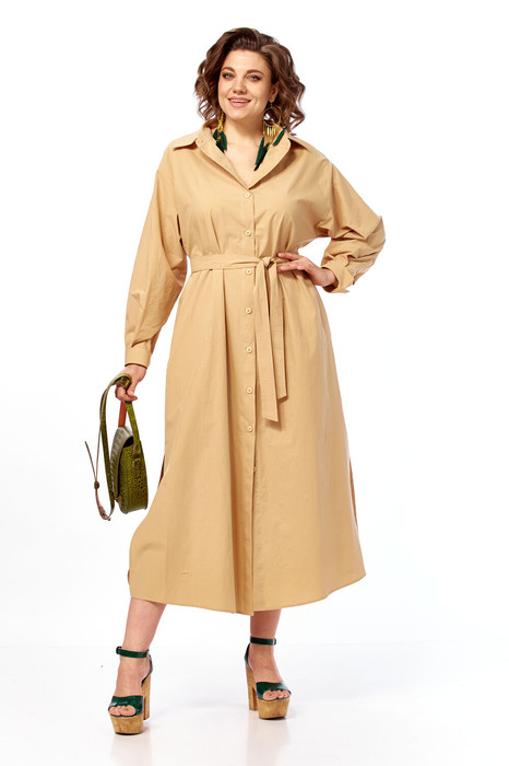 Платье женское свободного кроя с центральной застежкой на петли и пуговицы. Спина со встречной складкой застроченной сверху и в области талии. В боковых швах обработаны карманы. Рукав втачной со спущенной линией плеча. По низу рукавов разрезы с петлей и пуговицей и манжеты. Воротник рубашечный на стойке. По бокам обработаны разрезы. Пояс съемный. Фурнитура может отличаться от заявленной на фото.