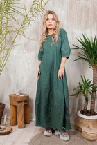 Платье женское полуприлегающего силуэта. Лиф отрезной с подрезом фигурной формы, повторяющим форму груди. По нижнему срезу лифа и поверхнему срезу юбки заложены складки. В боковых швах юбки обработаны карманы. Средняя часть лифа двойная. Рукав с притачной отложной манжетой, фиксирующейся на пробивные кнопки.  Застежка в платье на притачных планках через пробивные кнопки. Низ изделия обработан широкой обтачкой швом с закрытым срезом.