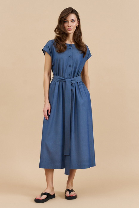 Платье женское приталенного силуэта с поясом-завязкой из основной ткани. По талии на резинке. Лиф с цельнокраеными планками и притачным воротником-обтачкой, со спущенным плечом, без рукавов. В боковых швах юбки выполнены потайные карманы.