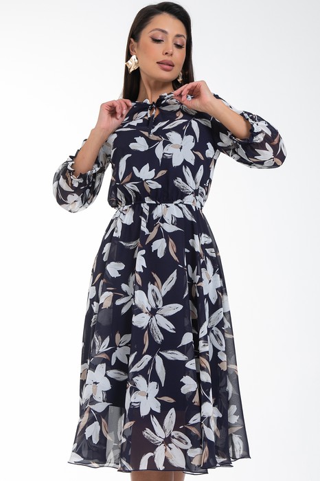 Летящее шифоновое платье подчёркивает достоинства вашей фигуры, делает Ваш образ женственным и нежным. Юбка платья полусолнце отрезная по линии талии. Полупрозрачные втачные рукава длиной 3/4 с низу подогнуты и сосборены на резинку. Платье с подкладом,притачным по горловине и пройме.По талии платье присборено на шпульную резину. Модель выполнена из шифона и трикотажного подклада.