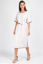 Платье женское, прямого силуэта. Вырез горловины по переду - "лодочка", по спинке V - образный. По переду рельеф, заканчивающийся разрезом, и волан, переходящий в горловину спинки. Волан обтачен тканью-компаньоном. В боковых швах карманы.