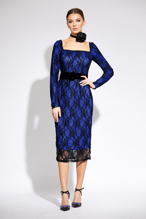 Платье выполнено из стрейчевого гипюра с рисунком. Платье приталенного силуэта, длиной ниже линии колена, вырез формы "каре" по переду и спинке. Рукав одношовный, втачной. Верхняя часть оката образует горловину и собрана на эластичную тесьму. Перед и спинка платья на отлетной к низу трикотажной подкладке. В комплект входит съемный пояс из черного бархата.
