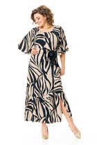 Платье выполнено из трикотажного полотна с геометрическим принтом. Платье прямого силуэта, длиной миди. Спинка цельная. Горловина V-образной формы. Плечевой шов спущен. Рукав рубашечного покроя, одношовный. В боковых швах карманы. Спереди в среднем шве разрез. В комплект входит съемный ремень из эластичной тесьмы с пряжкой.