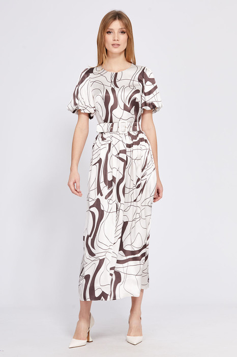 Платье выполнено из атласа с абстрактным принтом. Платье Х-образного силуэта, отрезное по линии талии, длиной миди.  Застежка в среднем шве спинки на потайную молнию. Горловина округлой формы. Плечевой шов заужен. Рукав втачной, одношовный, расширенный и присборенный по низу, на притачной по низу подкладке. Юбка расширена к низу. Заднее полотнище со средним швом. В боковых швах карманы. Платье на отлетной по низу подкладке. В комплект входит съемный ремень с обтяжной пряжкой.