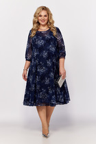 Платье выполнено из плательной ткани. Платье Х-образного силуэта, длиной миди, отрезное по линии талии. Горловина V-образной формы с завязками. На спинке в среднем шве застежка на потайную молнию. Плечевой шов укорочен. Рукав втачного покроя, одношовный, длиной 3/4 с вытачками по окату. Рукав расширен к низу, присборен на эластичную тесьму. Юбка расширена к низу. На заднем полотнище средний шов. В левом боковом шве обработан разрез.