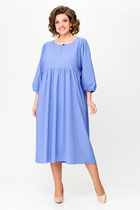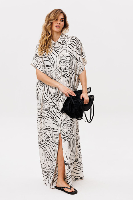 Платье выполнено из плательно-блузочной ткани с абстрактным принтом. Платье прямого силуэта, длиной в макси. Спереди центральная застежка до верха. Спинка цельная. Воротник стяче-отложной, с отрезной стойкой. Плечевой шов удлинен. Пройма углубленная.