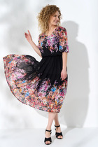 Платье выполнено из плотного атласа. Платье приталенного силуэта, отрезное по линии талии, длиной выше линии колена. Лиф выполнен в виде корсета, в рельефы вставлен регилин. Застежка на потайную молнию сзади в среднем шве спинки и юбки. Юбка прямого силуэта. Платье на притачной по низу подкладке. Брюки из гипюра с фестонами в комплект НЕ ВХОДИТ и продаются отдельно м.2999.