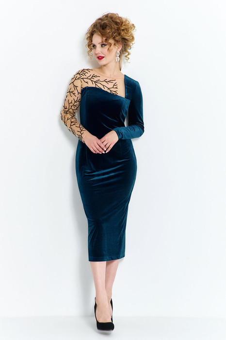 Платье женское выполнено из велюра и прозрачной сетки. Изделие прилегающего силуэта. По горловине выполнен асимметричный вырез со вставкой из сетки. На сетке по горловине и рукаву вышивка. Рукав втачной длинный, зауженный к низу. В модели исправлена ширина рукава в сетку.