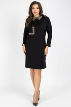 Платье женское повседневное прямого силуэта с фигурным низом. Выполнено из однотонного хлопка в сочетании с отделоной тканью с анималистичным принтом. Вырез горловины V-образного типа, рукав втачной со складками по низу с резинкой на фиксаторе, по полочке платья накладные карманы и два разреза. Горловина спинки с фигурным вырезом и пряжкой. Декором служат элементы из отделочной ткани.