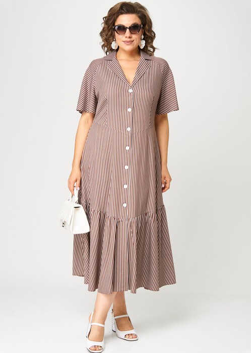 Платье женское повседневное полуприлегающего силуэта выполнено из хлопка с принтом "полоска". Застежка доверху на обметанные петли и пуговиц, вырез горловины отложной воротник. Рукав тачной "реглан" с разрезом по центру. Чуть ниже талии фигурный подрез, по низу платья волоан со сборкой. Декором платья служит дизайн самой ткани и отделочные пуговицы.